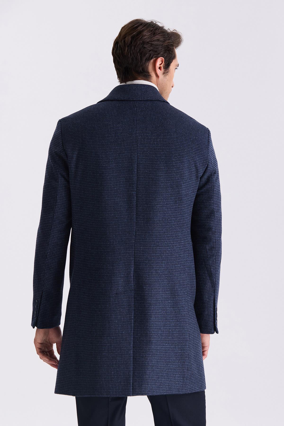 Koyu Lacivert Comfort Fit Berberi Yaka Kareli Desenli Yünlü Kaşe Kaban