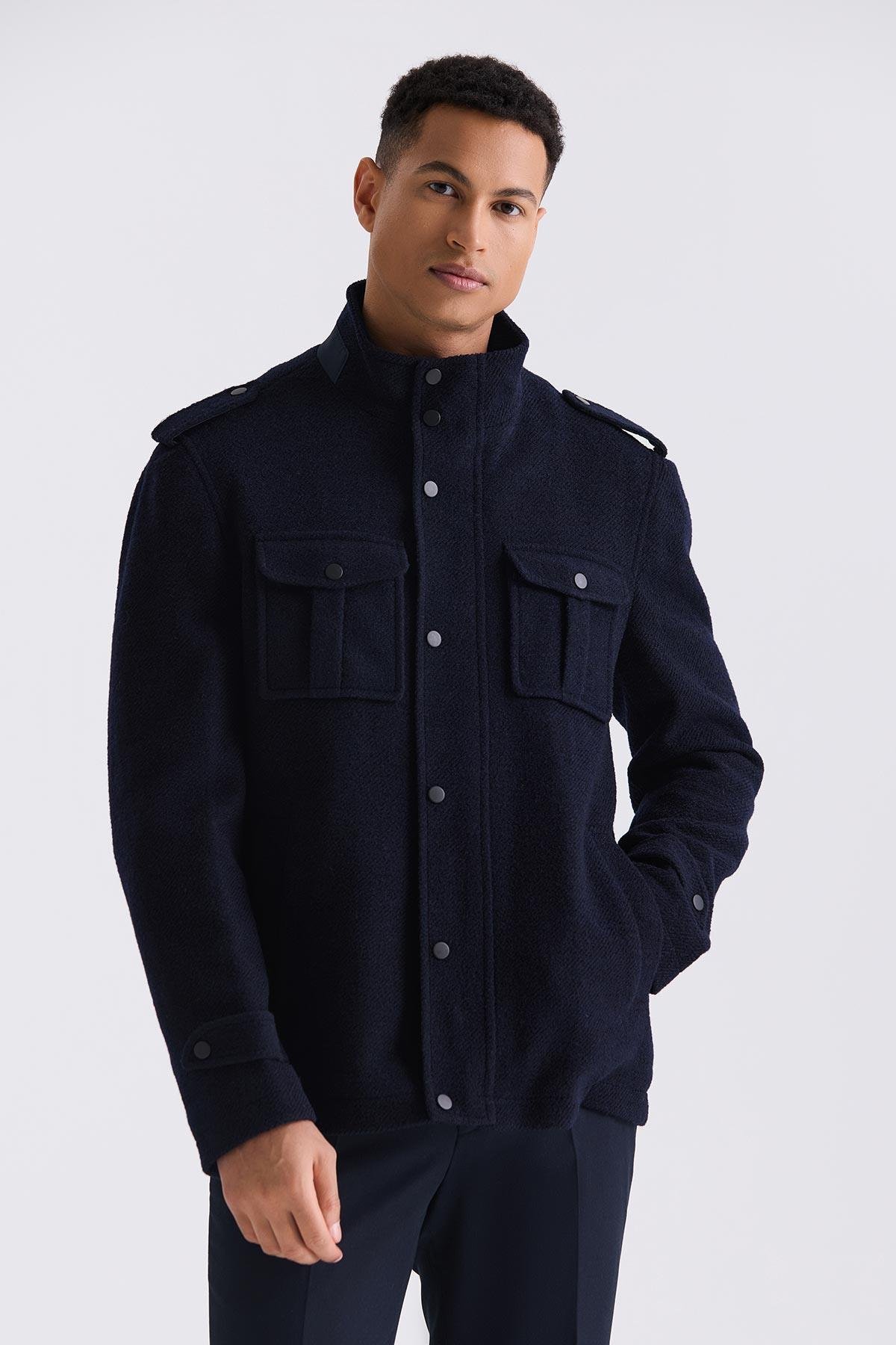Lacivert-2 Slim Fit Hakim Yaka Apoletli Desenli Spor Kaşe Kaban
