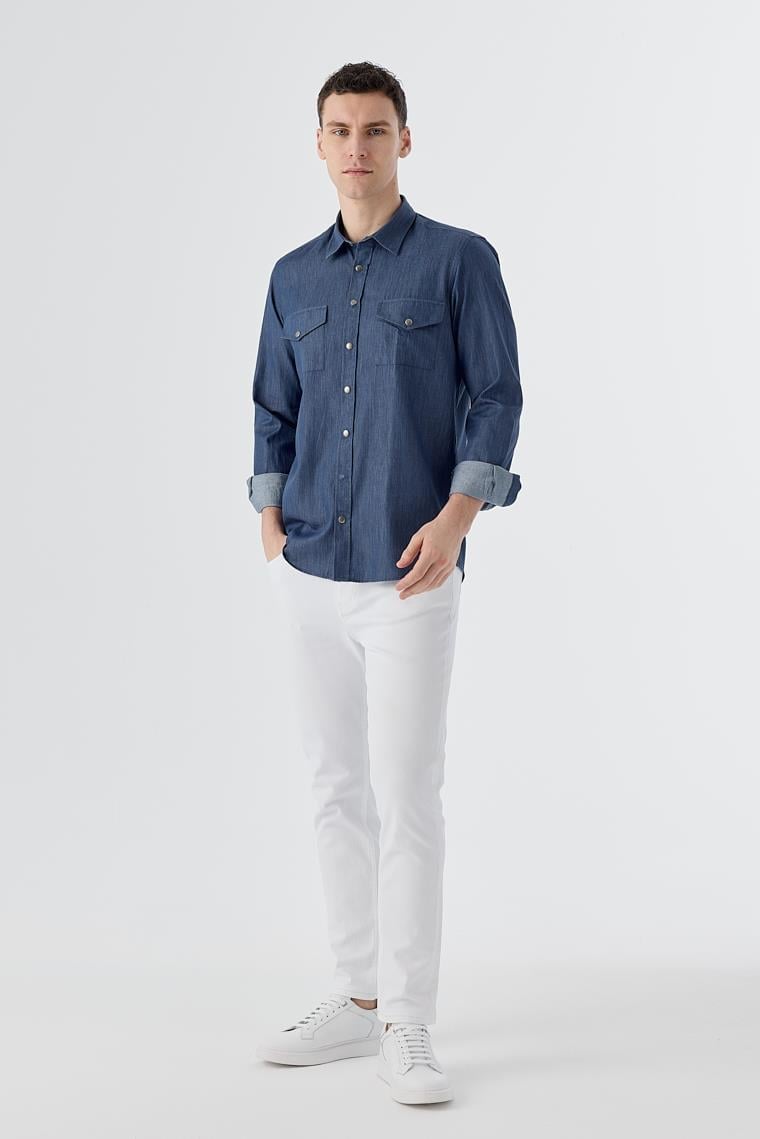 Lacivert Comfort Fit Cepli Çıtçıtlı %100 Pamuk Kot Gömlek (JK39CF01M042_002)