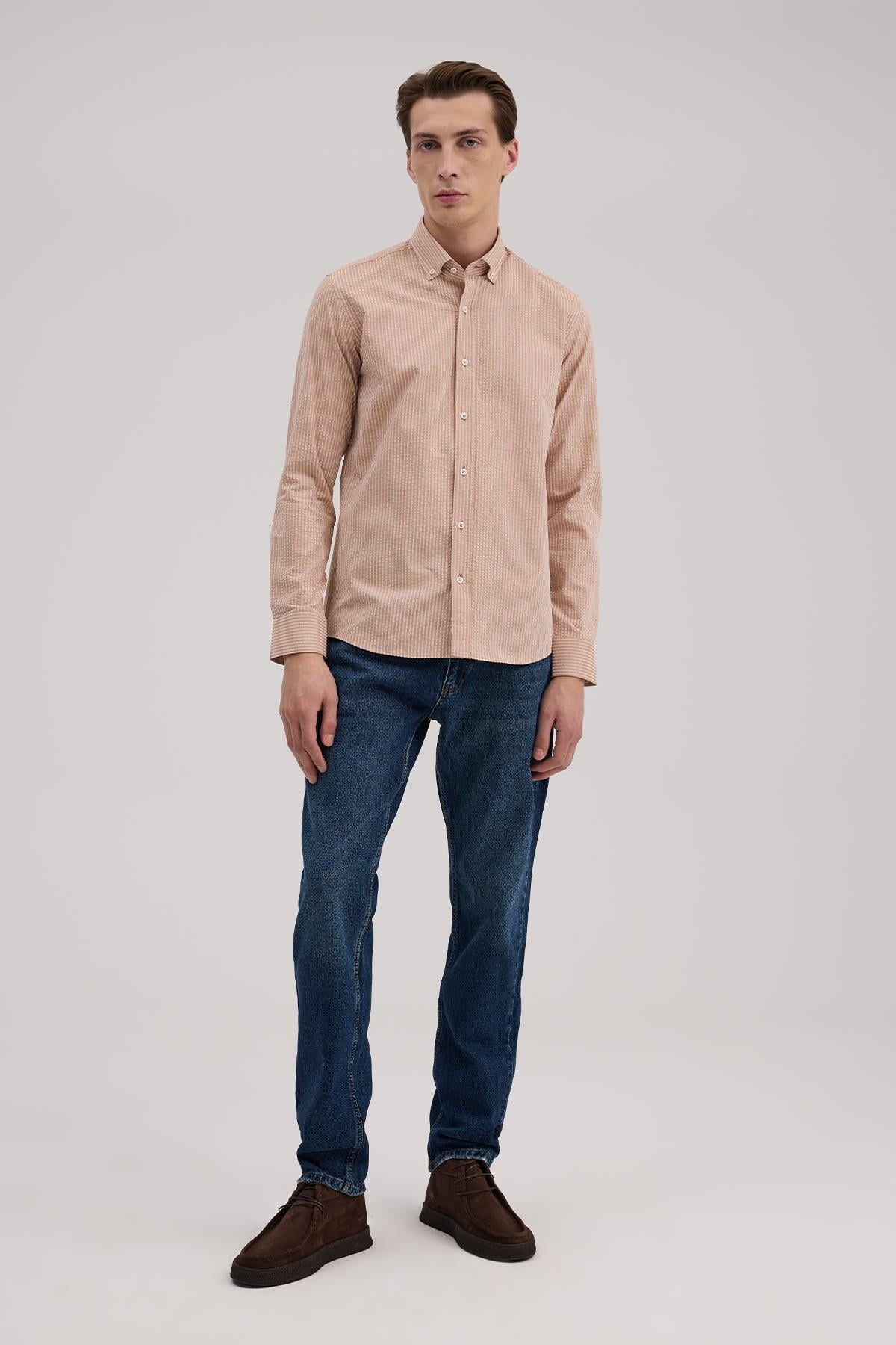 Kahve Rahat Kalıp - Comfort Fit Gömlek YAKA ÜSTTEN DÜĞMELİ