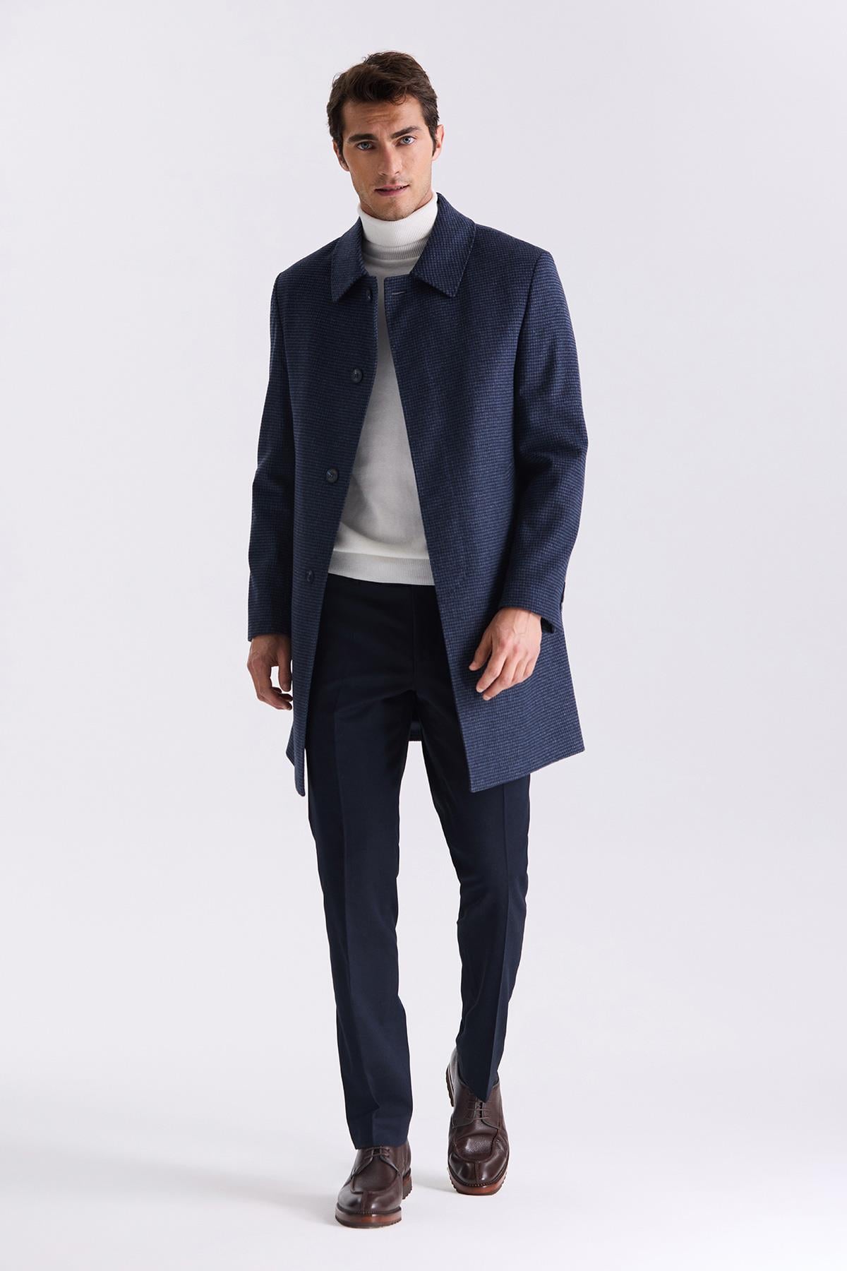 Koyu Lacivert Comfort Fit Berberi Yaka Kareli Desenli Yünlü Kaşe Kaban