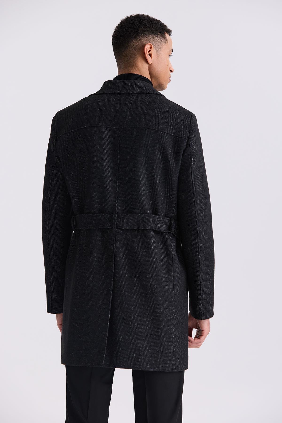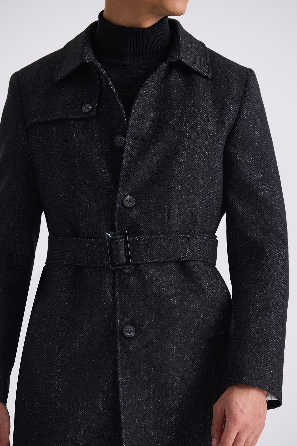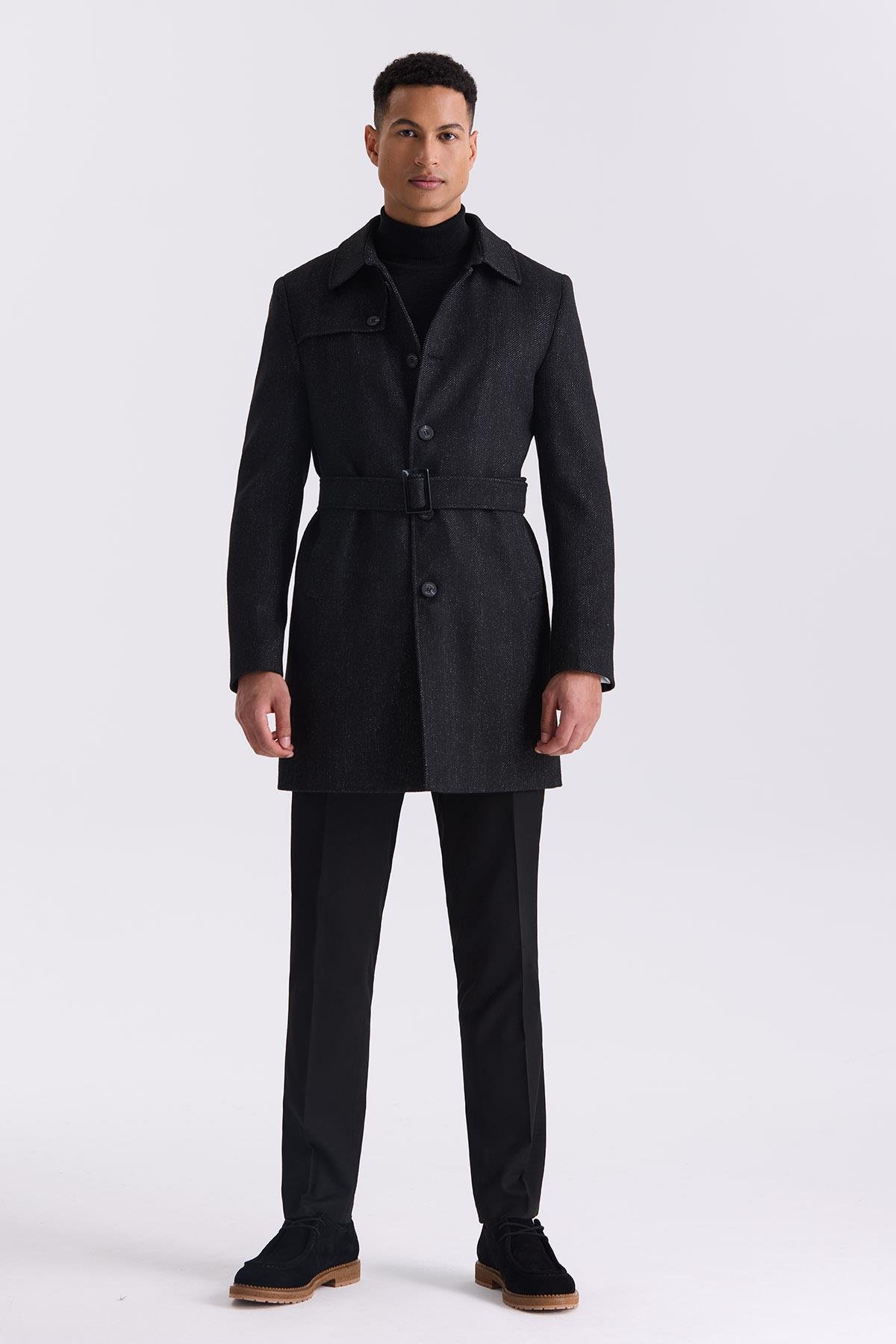 Siyah Comfort Fit Berberi Yaka Balık Sırtı Desenli Kemerli Yünlü Kaban