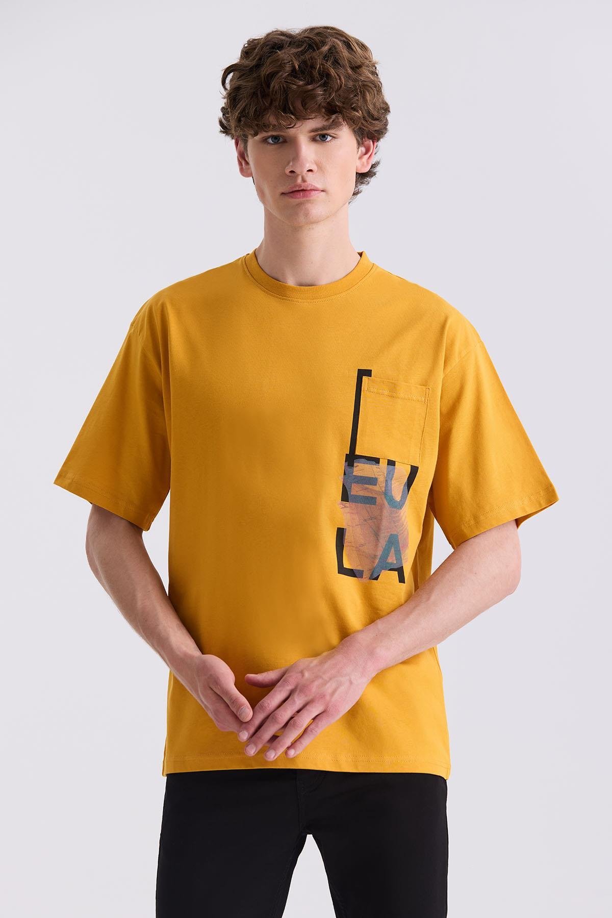 Sarı Yazı Baskılı Bisiklet Yaka T-Shirt