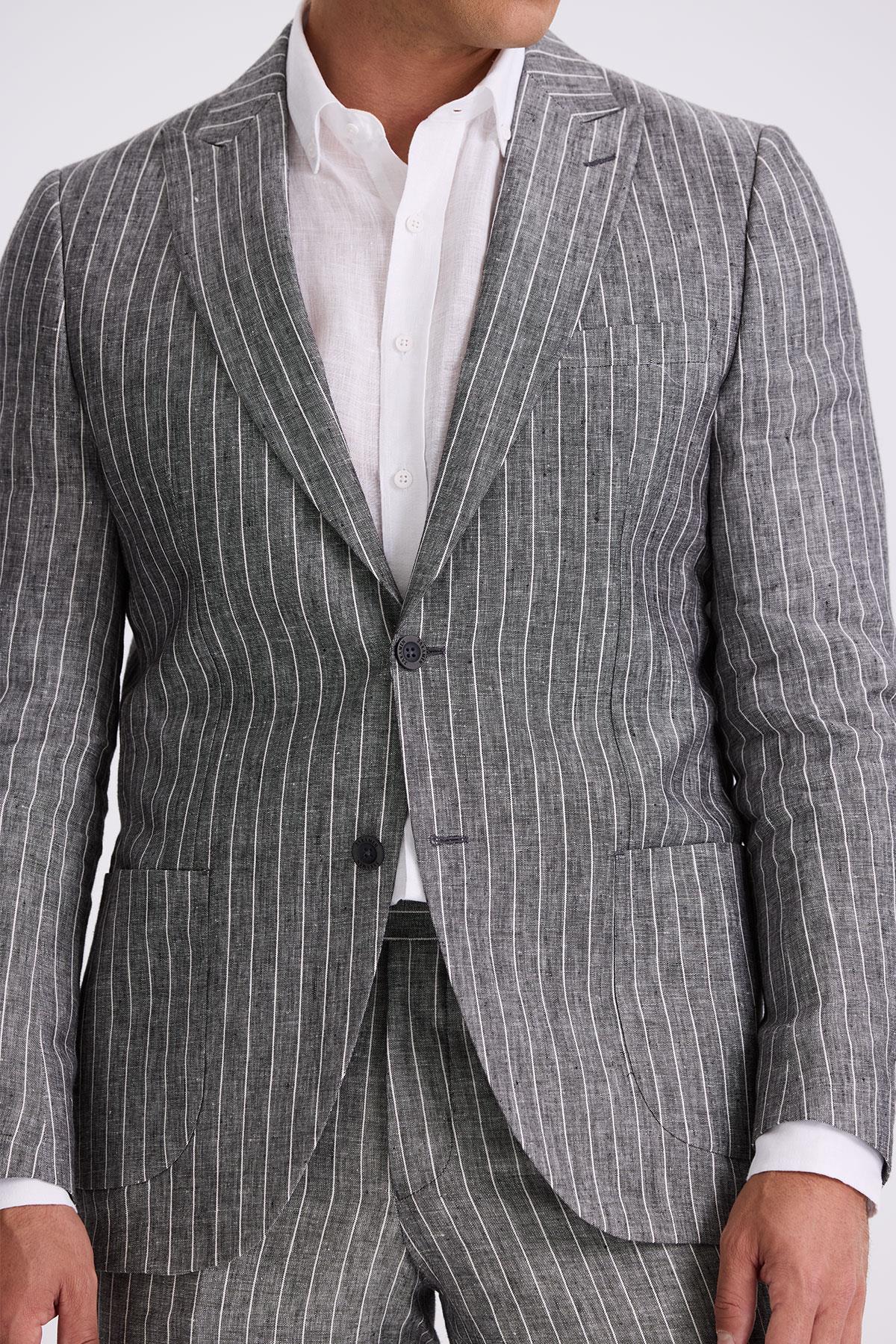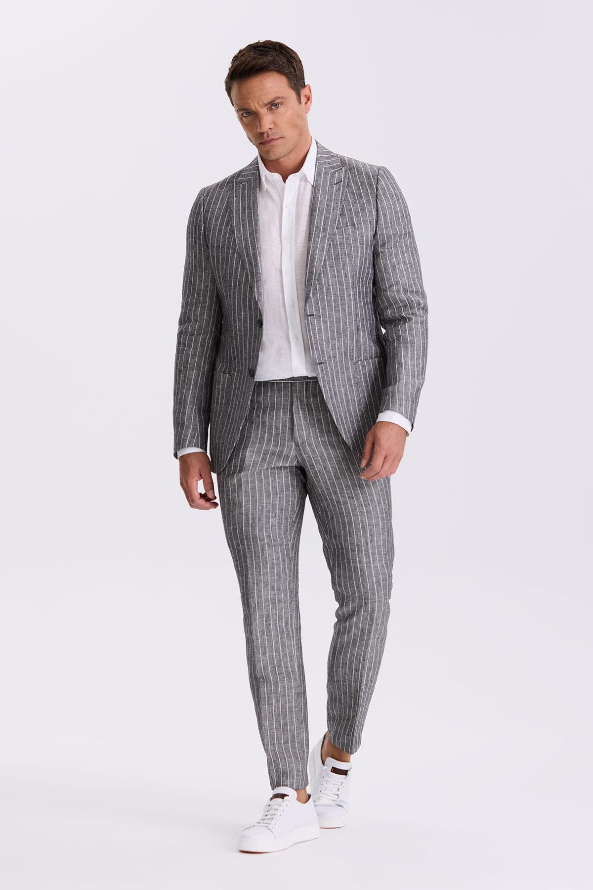 Siyah Slim Fit Kırlangıç Yaka Çift Yırtmaçlı %100 Keten Spor Takım Elbise