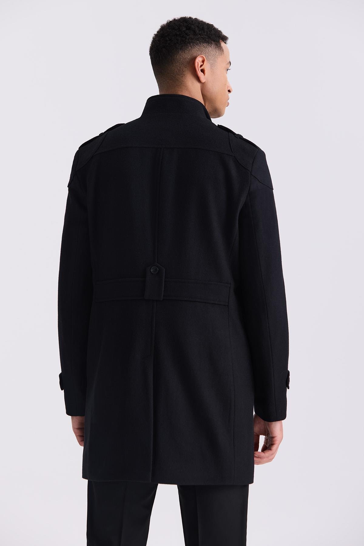 Siyah Regular Fit Hakim Yaka Apoletli Yünlü Kaşe Kaban