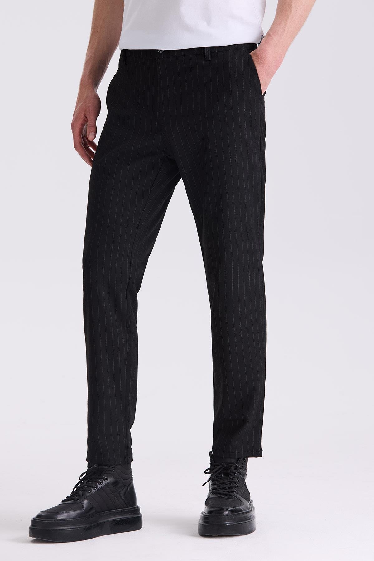 Siyah Slim Fit Cizgili Kanvas Pantolon