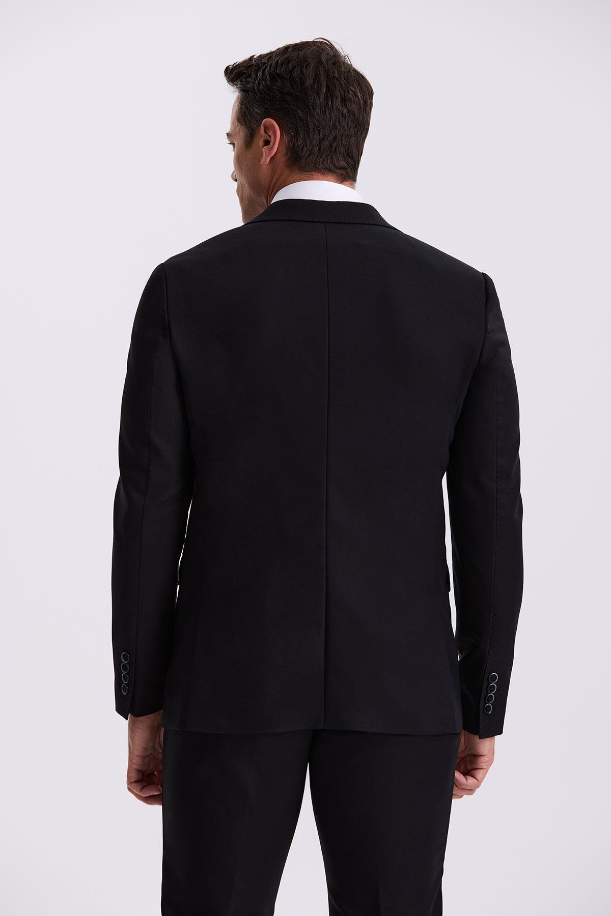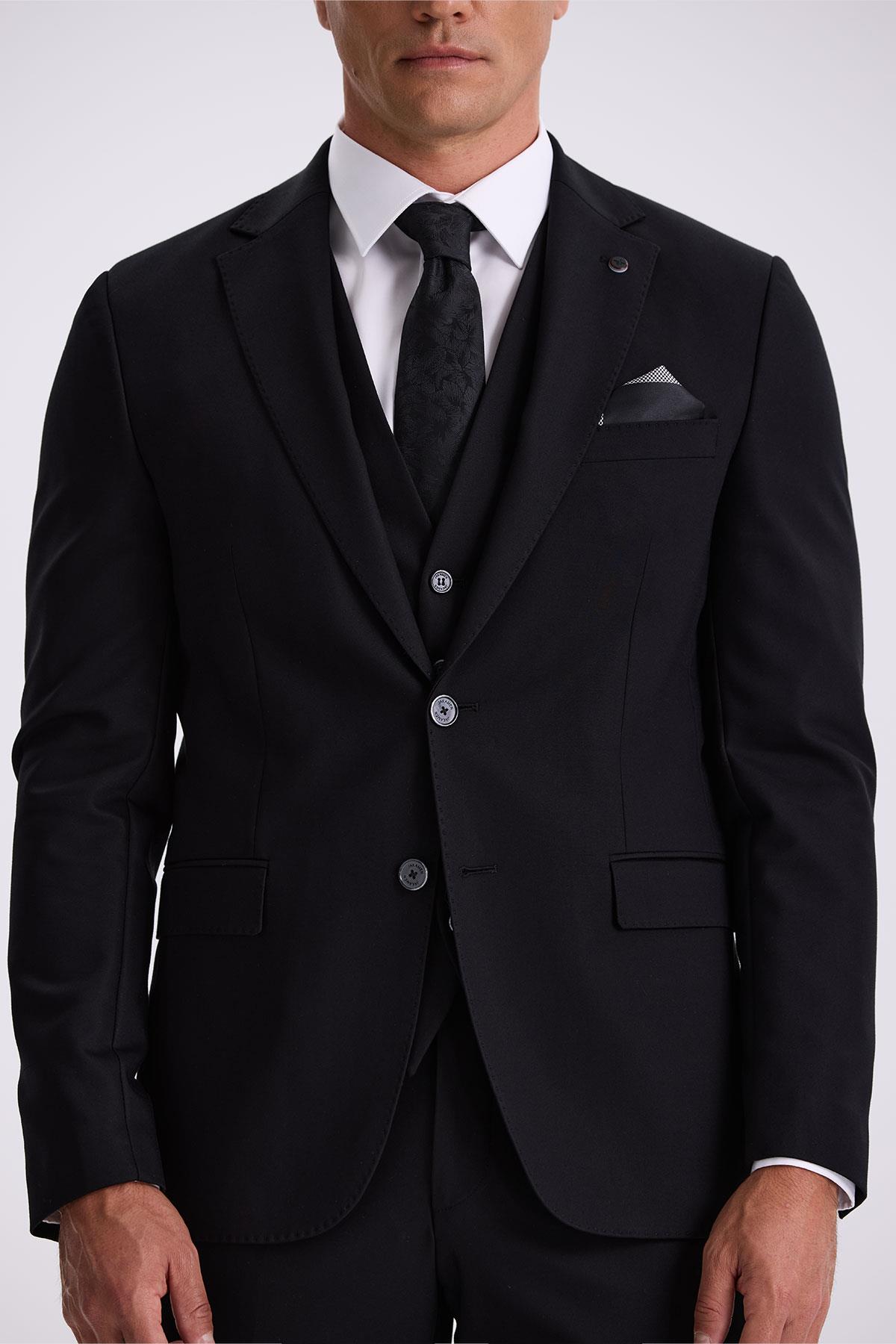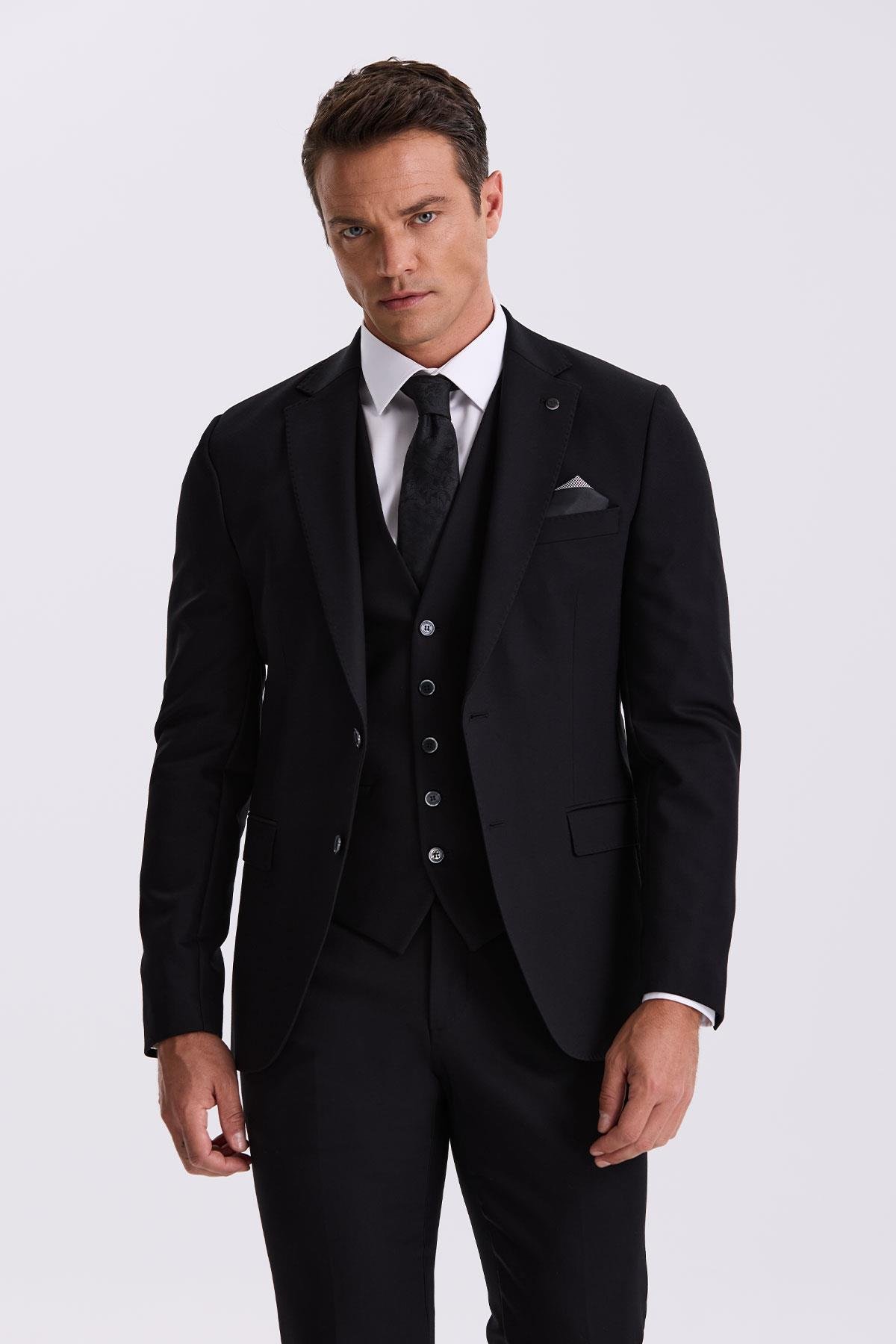Siyah Slim Fit Mono Yaka Çift Yırtmaçlı Yelekli Takım Elbise